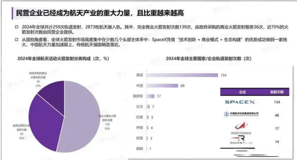 这代表着商业航天是航天产业从传统的政府主导向市场运作演进的根本性范式重构,其核心是以商业利润为首要目标,通过市场化机制实现资源配置最优化。市场格局呈现两大特征。一是商业卫星产业占据绝对主导,2024年全球航天收入达4150亿美元,其中商业卫星产业规模为2930亿美元,占比高达71%,收入主要集中在下游地面设备与卫星服务。二是民营力量强势崛起,在2024年全球259次发射中,由民营企业提供的发射服务占比近70%。