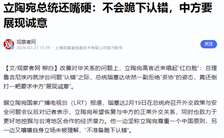 参考:立陶宛总统还嘴硬:不会跪下认错,中方要展现诚意——观察者网